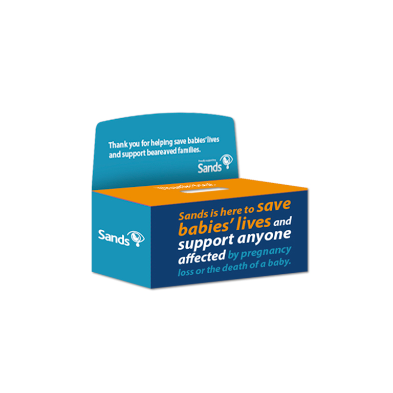 Order a cardboard collection box to collect loose change for Sands at home, at work or at your club, group or association.